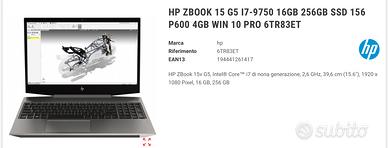 HP ZBook 15v G5, Intel® Core™ i7 di nona generazione, 2,6 GHz, 39,6 cm (15.6"), 1920 x1080 Pixel, 16 GB, 256 GB