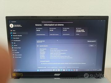 Vendo Acer Aspire 3 comprato nuovo a Settembre 2025 (ho la ricevuta valida per la garanzia fino a Settembre 2027). Il PC è perfetto, lo vendo esclusivamente perché ho iniziato l'università e ho bisogno di un computer più piccolo (14 pollici) da portare a lezione ogni giorno.