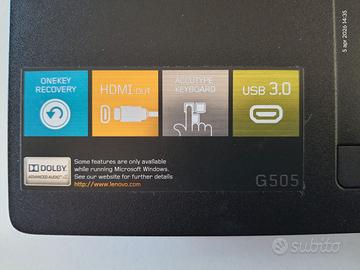 Salve,vendo notebook lenovo G505,con carica Batteria,funzionante in tutte le sue parti solo batteria guasta, il notebook lo vendo per ricambi perche troppo lento nelle applicazioni windows, astenersi perditempo contattare solo se interessati. caratteristiche tecniche:Sistema operativo windows 10 home 64bit ,ram 4GB ddr3 Hard disk 500GB.