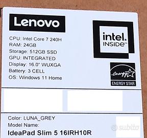 Notebook Ideapad Slim 5, case in alluminio e tastiera retroilluminata, monitor 16", processore Intel Core 7 240 H, RAM 24 Gb, SSD 512 Gb, modello italiano, acquistato nuovo a dicembre 2025, in garanzia fino a dicembre 2027, ancora in imballo originale, mai aperto. Modello specifico: IdeaPad_Slim_5_16IRH10R - 83J10064IX. Solo Ritiro a mano. In vendita presso Mediaworld a € 950.