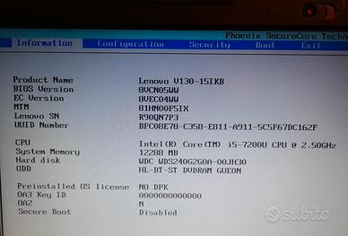 Vendesi notebook LENOVO V1230-15IKB ideale per ricambi in quanto la tastiera e il touchpad hanno alcuni problemi di funzionamento dopo una caduta che ne ha anche danneggiato un angolo dello chassis come da foto 5