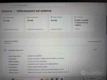 Vendo Notebook Lenovo usato ma in condizioni perfette, piccoli segni di usura, foto originali, in omaggio zainetto con mouse, alimentatore originale, batteria 60% Caratteristiche: Lenovo ThinkPad X1 Carbon Ultrabook di settima generazione: Core i7-8565U, 16 GB di RAM, SSD da 512 GB, display FHD da 14 pollici, tastiera retroilluminata italiana