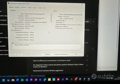 Vendo PC portatile Lenovo Yoga Pro 14APH8 14,5 pollici. Specifiche: - CPU Ryzen 7 7840HS - RAM 16gb LPDDR5x-6400 - GPU 4050 RTX 6gb VRAM GDDR6 - Schermo 3k (3072x1920) ips 120Hz - Memoria 1 TB M.2 2242 SSD. - Caricatore originale 140 watt con scatola originale. - Peso: 1,49Kg - Dimensioni 325.5 x 226.49 x 15.6 mm. - Colore Tidal teal - Batteria 73 Wh, stato attuale 170 cicli di carica. - Fotocamera FHD 1080p - Speaker 4 stereo speakers, 2W x2 (woofers), 2W x2 (tweeters), optimized with Dolby Atmos®, Amplifier (AMP) - Sistema Operativo Windows 11 Pro Presenti lievissimi segni di usura non visibili in foto. Acquistato nel 2023 dal sito Lenovo (con fattura).