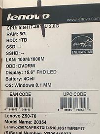 notebook usato in ottime condizioni LENOVO Z50-70, schermo 15,4”, processore intel i7 4510u, ram 8 Gb, hdd 1Tb, sistema operativo windows 10 (gia riprostinato alle inpostazioni di fabbrica).