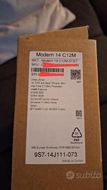 MSI Modern 14 C12M-073IT, Notebook 14" Full-HD 60Hz, Intel I7-1255U, Intel Iris Xe, 16GB RAM DDR4, 512GB SSD M.2 PCIe 3, WiFi 6, Win 11 Home. Usato pochissimo ed in perfette condizione come nuovo. Inutilizzato per passattio a PC aziendale. Imballo originale con caricabatteria originale. Perfetto e funzionante. vendo visto e piaciuto.