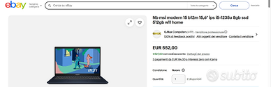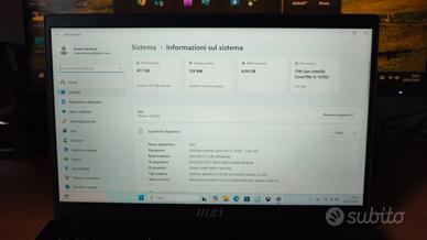 Notebook di recente costruzione con processore e memorie veloci. MSI Modern i5- 1235U - , processore Intel 12th Gen, ram 8 gb ddr 4 - 3200mhz, memoria interna ssd m2-512 gb , caricatore MSI, windows 11 . Portatile usato pochissimo e perfettamente funzionante , integro nelle sue parti compresa la batteria. Inoltre mouse wireless rgb ricaricabile con apposito cavetto incluso. Non ho più il pacco originale.
