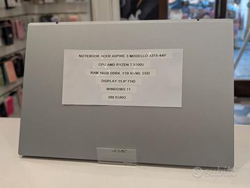 NOTEBOOK ACER ASPIRE 3 MODELLO A315-44P, usato, grado A, in garanzia Amazon fino a giugno 2027, a soli 380 euro. Disponibile in VIA PO 27, 10.00-13.15, 14.30-19.30 Facciamo permute e/o pagamento immediato cash per il tuo dispositivo usato. Possibilità di pagamento in 3 rate con klarna ad interessi zero. Spedizioni in tutta Italia con pagamento con le seguenti modalità: - Bonifico bancario anticipato - Contrassegno ( +10€ ) - In 3 rate con klarna ( +5% )