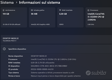 Notebook Ricondizionato Acer Travelmate P653-V-53324G32Mikk L'Acer TravelMate P653-V-53324G32Mikk è un notebook professionale da 15,6 pollici, questa specifica variante è progettata per il mercato business, offrendo caratteristiche di sicurezza e costruzione robusta. Processore: Intel Core i5-3320M con frequenza base di 2.6 GHz e Turbo Boost fino a 3.3 GHz. Memoria RAM: 6 GB Archiviazione: SSD (SATA) da 128 GB Schermo: 15.6" HD LED opaco (anti-riflesso) Grafica: Integrata Intel HD Graphics 4000 Sistema Operativo: Windows 11 Home (Originale ed attivato) Software: Pronto all'uso con software originali per la casa o per l'ufficio Costruzione: Chassis in lega di magnesio-alluminio per una maggiore resistenza agli urti Sicurezza: Include un lettore di impronte digitali e lettore di SmartCard Connettività: Dotato di 4 porte USB 3.0, VGA, HDMI, e-SATA, WiFi, LAN, Webcam, Microfono, cuffie, Lettore memory card, Masterizzatore DVD e una porta per docking station proprietaria sul fondo Tastiera: Layout esteso con tastierino numerico Batteria: Rimovibile dall'esterno, con un'autonomia di 3 ore