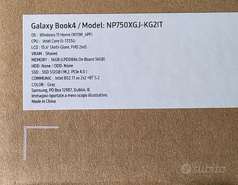 Vendo causa regalo NUOVO, MAI APERTO, ancora con sigillo, notebook samsung galaxy book4, processore intel i5, RAM 16 Gb, SSD 512 Gb, LCD 15.6'', WiFi + BT, Windows 11 Home. Modello: NP750XGJ-KG2IT Preferisco consegna a mano.