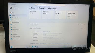 Vendo ottimo Notebook Toshiba Satellite Pro A50-E-1D8 Intel Core i7-7500U 8GB RAM DDR4 SSD 256 GB Windows 11 Pro italiano usato perfettamente funzionante. Notebook tenuto in ottime condizioni, condizioni come da foto. Batteria originale funzionante. Incluso alimentatore originale. PC pronto all'uso. Incluso Pacchetto Microsoft Office 2021. Caratteristiche Tecniche: Tipo di unità ottica: DVD Super Multi DL Diagonale dello schermo: 39,6 cm (15,6") Il rapporto di aspetto: 16:9 Risoluzione dello schermo: 1366 x 768 Pixel Processore cache: 4 MB Famiglia processore: 7° generazione di processori Intel Core i7 Frequenza del processore: 2,70 GHz Frequenza del processore turbo: 3,5 GHz Frequenza potenza termica design configurabile-basso: 800 MHz Litografia del processore: 14 nm Modello del processore: i7-7500U Il numero di porte USB di tipo 3.0 (3.1 Gen 1): 4 Ethernet LAN (RJ-45) numero di porte: 1 Numero di porte VGA (D-Sub): 1 Combo per cuffie / microfono, porta: Sì Il numero di porte HDMI: 1 Uscite jack per cuffie: 1 Fattore di forma memoria: so-DIMM Memoria interna: 8 GB Memoria interna massima: 32 GB Slot di memoria: 2x so-DIMM Tipo memoria interna: DDR4-SDRAM Velocità di clock di memoria: 2400 MHz Microfono incorporato: Sì Sistema Audio: DTS Studio Sound Dispositivo di puntamento: Touchpad Tastiera numero di tasti: 102 Bluetooth: Sì Bluetooth versione: 4.2 Standard wi-fi: IEEE 802.11 ac Ethernet: Sì Ethernet LAN velocità di trasferimento dati: 10,100,1000 Mbit/s Tipo di Antenna: 2x2 Wifi: Sì Il sistema operativo installato: Windows 11 Pro 64 Bit Italiano Versione Di Prova Del Software: Microsoft Office 2021 Fotocamera anteriore: Sì Fotocamera frontale risoluzione (numerico): 0,9 MP Risoluzione fotocamera frontale: 1280 x 720 Pixels SUPPORTI DI MEMORIZZAZIONE Disco a stato solido, capacità: 256 GB M.2 Compatibile con schede di memoria: MMC,SD,SDHC,SDXC Unità di Storage: SSD Numero di celle della batteria: 4 Tecnologia batteria: lithium-Ion