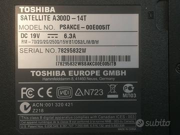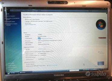 Vendo notebook Toshiba satellite A300D-14T funzionante, processore AMD Turion X2 Dual-Core Mobile RM-70 2.00 GHZ, RAM 4,00 GB, HDD 512 GB, schermo da 15,6 pollici, tastiera italiana, lettore/masterizzatore DVD, Wi-fi, blue-tooth, web cam integrata, sistema operativo originale Windows Vista. Il notebook è stato riportato allo stato originale ed è completo di alimentatore originale (19V, 6,3A), 2 DVD di ripristino, manuale utente e guida rapida. Altoparlanti integrati funzionanti, ma non supportano volumi alti e/o forti bassi.