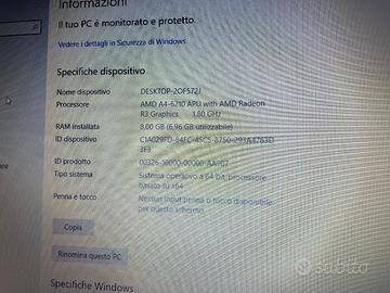 Per inutilizzo vendo notebook Toshiba Satellite C70D-B-10X con processore AMD A4, scheda grafica Radeon R3, 8gb RAM e SSD da 128gb; è perfetto per studenti di medie e superiori. La batteria è perfettamente funzionante, non ha ammaccature o parti rotte, ha un grande display da 17" (rispetto a quelli standard da 15,6") senza pixel bruciati. Regalo cassettino con hard disk da 500gb da installare al posto del lettore DVD così da avere due memorie interne nello stesso PC. Presenti la sua scatola e il caricabatterie originale. Windows 10 Pro e Office 2019 appena installati con licenza. Massima serietà e preferisco consegna a mano. Solo contatto con chat di subito.it