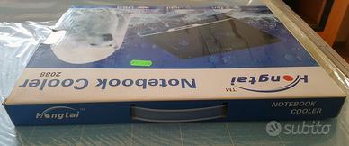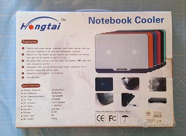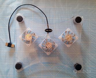 Base di appoggio per notebook con 3 ventole per raffreddarlo. La base si collega ad una qualsiasi presa USB e ha un adattatore USB passante che consente di non "sprecarla" e lasciarla disponibile anche per altri dispositivi. Le 3 ventole hanno anche dei led blu, con finalità puramente estetica.