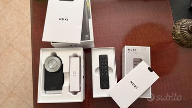 Nuki Smart Lock 3.0 (wi-fi) + Nuki Keypad 2 (modello con impronta digitale. La smart look ha il pacco batteria bianco appena sostituito (quello nero non era disponibile). La diversa colorazione non si nota un granché come si può vedere in foto. Il keypad 2 è il modello. con codice ed impronta digitale ed ha un dentino di plastica per l'aggancio alla base rotto come di vede in foto (non ne inficia ne il funzionamento né il blocco con la base). Per le caratteristiche tecniche dettagliate si può consultare il sito del produttore. Vendo i dispositivi per passaggio a smart look di diversa marca. Entrambi i dispositivi sono perfettamente funzionanti e ben tenuti. Si vendono entrambi con istruzioni e confezione di imballo originale. .Prezzo complessivo euro 250. Posso vendere i dispositivi separatamente.