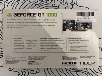 Vendo scheda video NVIDIA GeForce GT 1030 con 2 GB di memoria DDR5, interfaccia PCIe 3.0 e formato low profile, perfetta per PC compatti. Specifiche Tecniche: - Modello: PNY GeForce GT 1030 - Memoria: 2GB GDDR5 - Interfaccia: PCI-Express 3.0 - Uscite Video: 1x HDMI 2.0b, 1x DVI-D - Consumo: Bassissimo (TDP 30W), non richiede cavi di alimentazione aggiuntivi. Incluso: scheda video + bracket low-profile (come da foto)