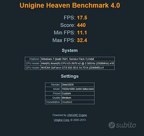 Ottima scheda video (alimentata a 6pin) Recupero da un lotto con altre GPU. pulita (PCB, dissipatore, ventola, pasta termica sostituita) TESTATA sotto sforzo nessun problema (vedasi screen) Ideale come scheda di emergenza (e giusto qualcosina in più) uscite video DVI-D DVI-i MINI HDMI (uscite tutte testate e funzionanti, con gli adattatori del caso in HDMI)