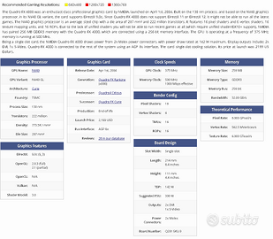 Nvidia Quadro FX4000 AGP 4x/8x 256MB 256 bit GDDR3 Core clock speed 375 MHz Memory clock speed 500 MHz Dissipatore maggiorato (prelevato da una GeForce 6800 Ultra EE). Pasta termica sostituita. Perfettamente funzionante. Solo scheda. No scatola. No accessori.
