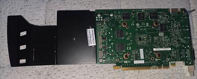 La scheda video mostrata nell'immagine è una NVIDIA Quadro K4000. Si tratta di una scheda grafica professionale destinata a workstation, basata sull'architettura NVIDIA Kepler. Ecco le sue caratteristiche principali: Memoria: 3 GB di tipo GDDR5. Interfaccia: PCI Express 2.0 x16. Connettività: Tipicamente include una porta DVI-I e due DisplayPort. Utilizzo: È progettata per applicazioni professionali come CAD, modellazione 3D e video editing.