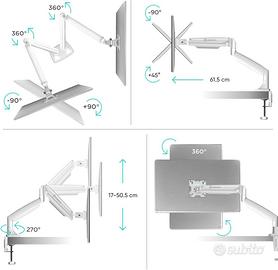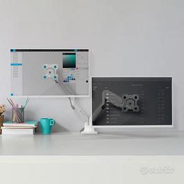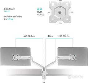 Il supporto è dotato di 2 bracci in grado di sostenere due monitor, montati su piastre VESA 100x100 oppure 75x75 , di dimensione tra i 13 e i 32 pollici.