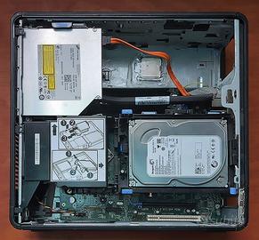 Desktop Dell OptiPlex 780 SFF. Il PC manca dell'alimentatore. Può essere facilmente completato, oppure sfruttato per pezzzi di ricambio e/o accessori. Tutto ciò che è presente, è perfettamente funzionante. Motherboard Dell E93839 GA0404 RAM 2x2GB (espandibile fino a 4x4GB) Hard Disk Seagate 160 GB Processore: il PC viene inviato con due processori Intel Pentium Dual-Core E5400 2.7 GHz Intel Core 2 Duo E8400 3.0 GHz Supporta windows 7, 8 e 10 Masterizzatore DVD+RW Lettore di schede Connettività: 6 USB 2.0 + 2 sul pannello anteriore, eSATA, HDMI Scambio brevi manu nel ravennate, o spedizione a carico dell'acquirente. Prezzo non trattabile. Astenersi perditempo.