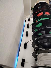 Sono inoltre incluse delle strisce a led comandabili tramite app per fare foto o video, regolando colore e luminosità, 5 roller per le bobine e dei ripiani inferiori dove poter sistemare filamenti o utensili.