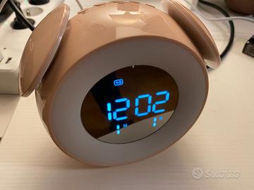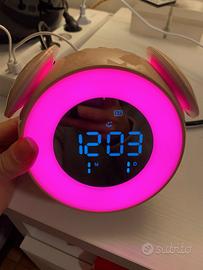 Ottima anche come regalo. Sveglia ed orologio da tavolo con luce multicolore incorporata. Perfetta anche con night light per bambini. Si può scegliere il colore della luce e l'intensità. Anche la sveglia ha almeno sette tipologie di canzoncine differenti (se non ricordo male). La luce sullo schermo si può spengere totalmente. All'interno c'è il cavo per collegarla all'alimentazione.
