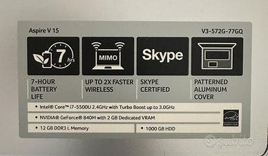 Vendo PC ACER ASPIRE V15 I7 in perfette condizioni + caricabatterie + borsa + mouse
