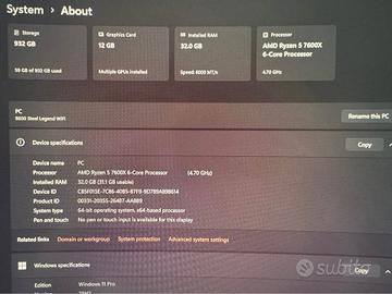 🖥️ PC GAMING/ASSEMBLATO TOTAL WHITE PREMIUM - RTX 4070 SUPER AERO OC - R5 7600X 🔥 BUILD FRESCA (parti nuove acquistate gennaio 2026) - ASSEMBLAGGIO PROFESSIONALE: 💎 GPU: Gigabyte RTX 4070 SUPER AERO OC WHITE 12GB (usata, perfette condizioni) ⚡ CPU: AMD Ryzen 5 7600X 6-core (NUOVA) 📡 Mobo: ASRock B650 Steel Legend WiFi 6E - BIOS AGGIORNATO (NUOVA) 🧠 RAM: G.Skill Trident Z5 RGB DDR5-6000 32GB (2x16GB, usata) 🔌PSU: MSI MAG 750W (usato) ❄️ Cooler: GAMEMAX Sigma 550 WHITE ARGB 220W TDP (NUOVO) 💾 SSD: Kingston NV3 1TB NVMe PCIe 4.0 (NUOVO) 🏠 Case: Montech AIR 903 WHITE Tempered Glass (NUOVO) 🪟 OS: Windows 11 Pro RETAIL - LICENZIATO E AGGIORNATO - ripulito tramite Win11Debloat (MSI Center + NVIDIA Control Panel installati, nessun altro software) 📊 CHINEBENCH: MP Ratio 5.49x ✨ Cable management professionale ✅ PC SUPER SILENZIOSO - avvio in pochissimi secondi! ✅ TOTALMENTE AGGIORNATO - Bios e Driver Ritiro a mano zona Vicenza e Padova No perditempo e offerte strampalate - non riceverete risposta