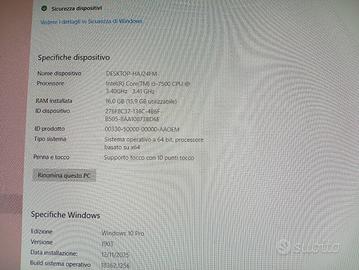 vendo PC all-in-one HP Elite One CPU Intel I5-7500 monitor 23.8 Full HD touchscreen RAM 16gb 2666mhz SSD 512gb video Intel 630 sistema audio Bang& Olufsen 150€