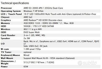 vendo pc all in one msiae200 ottime condizioni nelle foto caratteristiche tecniche
