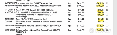 Vendo per scarso utilizzo potente PC desktop assemblato (per motivi lavorativi) in perfette condizioni anno di acquisto 2023. Costo di acquisto 1600 euro come da foto. In allegato specifiche tecniche e costo di ogni componente. Prezzo 650, consegna zona Ostia