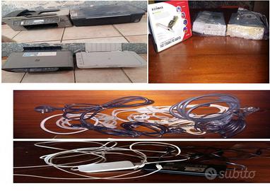 In blocco materiale di informatica generale molto grande, composto da pezzi vintage e più recenti, anni 80 90 e 2000. Computer case anni 80 e 90 completi di sistema operativo windows 95 windows 98, lasciati funzionanti. Più tutto dell’epoca, schermi monitor tastiere lettori floppy disk lettori cd scanner fax modem mouse tra cui il famoso Dexxa versione PS/2 nuovo inscatolato, almeno due Ups Back UPS CS 500, stampanti cartucce calcolatori calcolatrici con rotoli nastri, lettori masterizzatori cd / dvd nuovi, scheda rete Fast Ethernet Pci Adapter nuova, tantissimi cavi collegamenti attacchi fili prese varie prolunghe e prese scart, cavi alimentazione collegamenti per pc tv stampanti monitor, attacchi 2 poli a 3 poli tripolari a 3 poli ambedue gli estremi cavi alimentazione con spine italiana classica a 2 e 3 entrate italiana a 2 e 3 angolare e una dozzina a schuko; quasi tutti nuovi mai usati. Svariati cavi adattatori e connettori rankie vga/ vga e dvi diverse entrate e lunghezze + prese prolunghe scart + cavi per pc stampanti modem tipo cavi usb 2.0 A maschio/femmina, usb mini B maschio, usb hi-speed, cavi coassiali, cavi svhs - mini din 4 poli maschi/maschi, maschi/femmine ecc. di diversi tipi + alimentatori caricabatteria Jvc ricarica batteria e Apple per pc + svariati cavi per collegamenti attacchi morsetti porte telefono, modem adsl prese ethernet / lan e prolunghe cavo riduzioni derivazioni ecc. Alcuni pezzi rari, ad es. il Canon P21-D, l’Olivetti Logos 452, stampante Epson Stylus grande, le cartucce, più altri accessori ricambi nuovi mai usati ecc ecc. Tutto lasciato funzionante ben conservato in alloggi e scatole. Più altri pc case monitor tastiere ecc. vintage e recenti non fotografati, idem tanti altri accessori non fotografati ma comunque inclusi. Date un’occhiata alle molteplici foto,anche per chi volesse rivendere singole apparecchiature e singoli componenti, alcuni pezzi da soli hanno prezzi di mercato molto interessanti, chi è interessato mi contatti.