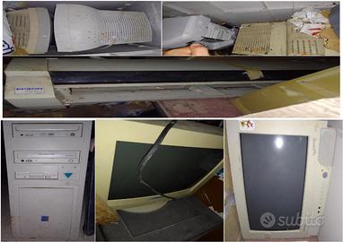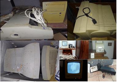 Blocco materiale informatica grande, pezzi vintage e recenti, anni 80 90 2000/10. Ad es. due monitor display recenti 1 al plasma Samsung da 42" e 1 lcd HP da 17" perfettamente funzionanti, anche computer case anni 80 e 90 con sistema operativo windows 95 e 98 lasciati funzionanti, più schermi monitor tastiere lettori floppy disk lettori cd scanner fax modem mouse tra cui il famoso Dexxa versione PS/2 nuovo inscatolato, almeno 2 Ups Back UPS CS 500, stampanti cartucce nuove calcolatori calcolatrici con rotoli nastri, lettori masterizzatori cd/dvd nuovi, scheda rete Fast Ethernet Pci Adapter nuova, tanti cavi collegamenti attacchi fili prese varie prolunghe e prese scart, cavi alimentazione collegamenti per pc tv stampanti monitor, attacchi 2 poli a 3 poli tripolari a 3 poli ambedue gli estremi cavi alimentazione con spine italiana classica a 2 e 3 entrate italiana a 2 e 3 angolare e una dozzina a schuko; quasi tutti nuovi mai usati. Svariati cavi adattatori e connettori rankie vga/ vga e dvi diverse entrate e lunghezze + prese prolunghe scart + cavi per pc stampanti modem tipo cavi usb 2.0 A maschio/femmina, usb mini B maschio, usb hi-speed, cavi coassiali, cavi svhs - mini din 4 poli maschi/maschi, maschi/femmine ecc di diversi tipi + alimentatori caricabatteria Jvc ricarica batteria e Apple per pc + svariati cavi e attacchi morsetti porte telefono, modem adsl prese ethernet / lan e prolunghe cavo riduzioni derivazioni ecc. Alcuni pezzi rari, come il Canon P21-D, l’Olivetti Logos 452, stampante Epson Stylus grande, le cartucce, più altri accessori ricambi nuovi mai usati ecc. Tutto lasciato funzionante ben conservato in alloggi e scatole. Più altri pc case monitor tastiere ecc. vintage e recenti non fotografati, idem tanti altri accessori non fotografati ma comunque inclusi. Date un’occhiata alle molteplici foto, anche per chi volesse rivendere singole apparecchiature e singoli componenti, alcuni pezzi da soli hanno prezzi di mercato molto interessanti… Tutto a 450€
