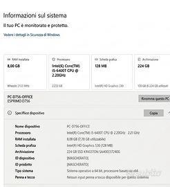 Vendo per inutilizzo postazione PC completa, perfettamente funzionante e molto veloce. Ottima per ufficio, studio, casa o gestione documenti. CARATTERISTICHE PRINCIPALI: • PC: Fujitsu Esprimo (Ultra compatto, occupa pochissimo spazio). • Processore: Intel Core i5-6400T. • RAM: 8GB DDR4. • Disco: SSD da 224GB (avvio rapidissimo). • Monitor: EIZO professionale (qualità immagine superiore, ideale per non affaticare la vista). • Extra: Mouse e tastiera e chiavetta wifi inclusi. • Software: Windows 10 Pro originale già configurato. Il PC è pronto all'uso, basta collegare la spina. Già formattato nel rispetto della privacy. PREZZO: 180€ trattabile Valuto scambio con prodotti di mio gradimento