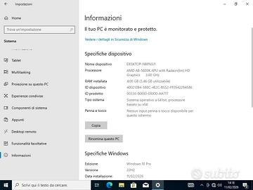 M/B ASUS F2A55-M LK2 PLUS, CON CPU AMD A8 APU RADEON HD GRAPHICS A 3600 MHz. RAM 4 GB DDR3 1600 MHz, CON DISSIPATORE E VENTOLA. HARD DISK DA 500 GB CON INSTALLATO WINDOWS 10 PRO CON LICENZA DIGITALE, ALIMENTATORE DA 500 WATT. IL PC E' FUNZIONANTE E FORNISCO LA MASCHERINA POSTERIORE DELLA M/B. AGGIUNGO TASTIERA E MOUSE COME IN FOTO. IL MONITOR NON E' COMPRESO.