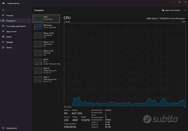 Pc di fascia alta, ideale che per chi cerca alta prestazione fino a 2k con doppio monitor durante sessione di gaming e streaming passando da FPS a single player in qualità ultra . Il pc è pronto all uso con licenza Windows già attiva. COMPONENTI GPU: Radeon RX 7800 XT Steel Legend 16GB GDDR6 (White Edition) DISSIPATORE: CORSAIR iCUE LINK TITAN 360 CASE: Mars Gaming MCV4 VENTOLE: 6x Ventole RGB EZDIY-FAB CAVI: Kit Extension Cables White ALIMENTATORE: Mars Gaming 750W Full Modular 80+ Silver STORAGE: Lexar EQ790 1TB SSD M.2 NVMe 1.4 SSD Interno, 7000 MB/s KIT PERIFERICHE: Tastiera 60% Yindiao T8 + Mouse Corsair Harpoon PRO RGB PROCESSORE: AMD Ryzen 7 7800X3D SCHEDA MADRE: GIGABYTE B650 AORUS ELITE AX V2 RAM: CORSAIR VENGEANCE DDR5 16GB 6000Mhz (2x8GB) Il PC è tenuto maniacalmente e sempre pulito, sono comprese scatole originali per tutti i componenti, mai overclockato. NO PERDITEMPO! Leggermente trattabile Consigliato ritiro a mano Spresiano o zona Treviso Spedizione tracciata con costo variabile dato l aggiunta di una scatola in più per inserire tutte le scatole e anche dalla distanza di spedizione Disponibile a inviare video dei componenti in funzione e benchmark.