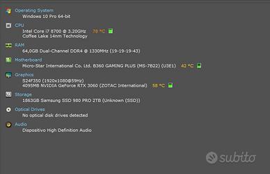 Vendo Pc da gaming spettacolare—Intel Core i7 8700 @ 3.20GHz, NVIDIA GeForce RTX 3060 (ZOTAC International), Componenti: Operating System Windows 10 Pro 64-bit CPU Intel Core i7 8700 @ 3.20GHz70 °C Coffee Lake 14nm Technology RAM 64,0GB Dual-Channel DDR4 @ 1330MHz (19-19-19-43) Motherboard Micro-Star International Co. Ltd. B360 GAMING PLUS (MS-7B22) (U3E1)42 °C Graphics S24F350 (1920x1080@59Hz) 4095MB NVIDIA GeForce RTX 3060 (ZOTAC International)59 °C Storage 1863GB Samsung SSD 980 PRO 2TB (Unknown (SSD)) Optical Drives No optical disk drives detected Audio Dispositivo High Definition Audio
