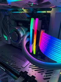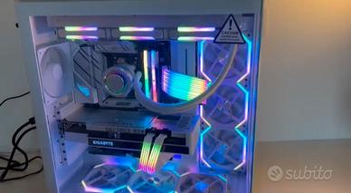 Specifiche: • CPU: AMD Ryzen 9 7900X • GPU: RTX 3070 Ti Gigabyte Vision OC • RAM: 32GB DDR4 3200 Corsair x2 • SSD: Samsung 980 Pro NVMe 2TB • Scheda madre: ASUS ROG Strix B650-A Gaming • Alimentatore: ASUS ROG Strix 850W Gold White • Raffreddamento: Lian-Li Galahad 360mm AlO • Case: NZXT H9 Elite white (vetro doppia camera) i • 6x Lian-Li UNI FAN RGB + Strimer RGB cables • Supporto GPU verticale Estetica total white + RGB, cable management perfetto.