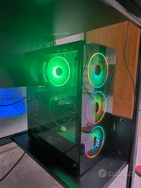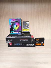 Case Noua con vetro temperato con 6 ventole RGB incluse (gli RGB sono un po' rovinati per il passare del tempo) con cui si può cambiare il colore grazie al pulsante di sopra del case, scheda madre Msi B550M Pro, 16 GB di RAM Corsair Venegance Lpx DDR4 da 3200Mhz con 512 GB di memoria SSD M.2, CPU AMD Ryzen 5 Pro 4650G con raffreddamento ad aria Cooler Master Hyper 121 Halo Black RGB compatibili con Asus aura sinc, gigabyte RGB fusion, Msi mystic light ASrock polychorme (Nuovo di 1 anno), scheda video MSI Mech2x AMD Radeon RX6500 XT OC (nuova di 1 anno) con PCIe 4.0, 4 GB di RAM DDR6 a 64-bit con una display port e HDMI (è rotta la levetta sulla scheda madre che serve per togliere la scheda grafica), alimentatore gamemax da 600W 80 plus bronze. Con il PC sono incluse le scatole della scheda madre dove c'è un cavo sata, manuale per come montare il PC, un CD e alcune vitine, scatola delle RAM con manuale delle istruzioni d' uso, scatola del raffreddamento con manuale di montaggio, adattatori per schede madri per socket AMD AM5 e AM4 e Intel LGA 1700/1200/1151/1150/1155/1556 infine scatola della scheda video con la guida di uso, imballaggio della scheda grafica
