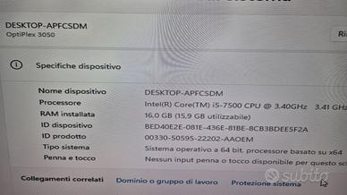 Vendo come da foto computer fisso Dell Optiplex modello 3050, con cavo alimentazione, mouse, tastiera e monitor 22 pollici con cavo alimentazione. Postazione completa, pronto all'uso. Pc e display in ottime condizioni estetiche e perfettamente funzionanti in tutte le loro parti. Caratteristiche del dispositivo: Processore intel i5-7500 Memoria interna 120GB SSD RAM 16GB Sistema operativo Windows 11 Pro Lettore CD DVD Porte disponibili: 8x USB A 1x HDMI Video 1x DisplayPort video 1x LAN Ethernet 1x Jack audio cuffie Possibilità di ritiro a mano o spedizione. No tuttosubito.