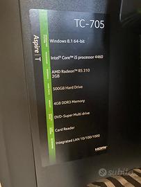 Usato pochissimo vendo x inutilizzo Aspire TC-705 Intel ® Core ™ i5 processor 4460 RAM 4GB DDR3 Memory HDD 500GB Hard Drive AMD Radeon ™ R5 310 2GB Integrated LAN 10/100/1000 CARD READER Eventualmente c’e anche monitor, tastiera e mouse da aggiungere accordandosi.