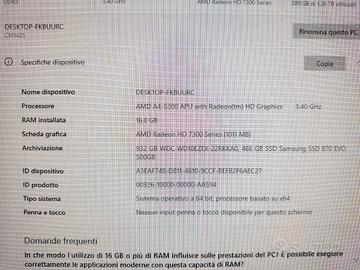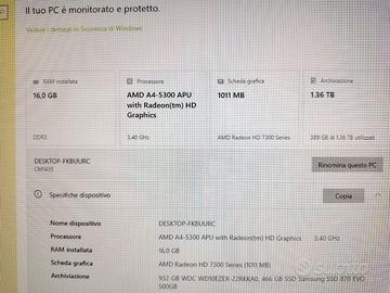 PC desktop Asus AMD A4 - 5300 RAM 16 GB, scheda grafica Radeon HD 7300, HD SSD Samsung evo 500 GB + hd sata wdc wd10ezex da 1 TB, wifi, porte anteriori 2 USB + lettore SD + jack mic e cuffia, masterizzatore DVD, porte posteriori 4 USB, HDMI, ethernet, VGA, entrata e uscita audio, porta mouse e tastiera PS/2. os Windows 10. computer configurabile e aggiornabile con nuovo hardware più recente.