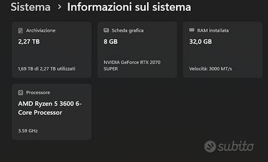 Caratteristiche: Cpu Ryzen 5 3600 amd Scheda madre asrock itx b450 Ram 32gb Nvme corsair 512gb Hard disk 1,5 TB Alimentatore Riotoro build 80+bronze Scheda video Rtx 2070 super 8gb Ventole argb thermaltake Case phantecks evolve Itx Note ammaccatura sul case posteriore ma non ne compromette ne il funzionamento ne la chiusura del pannello. Qualche graffio dovuto all usura.