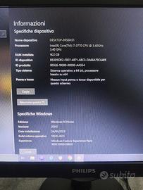 BELLISSIMO REGALO da fare, Come da foto puoi vedere le caratteristiche, monta un SSD da 500 GB. Processore i7. Completo di monitor, mouse, tastiera, casse e un'antenna usb wifi. Sistema operativo w10. Scheda video. Presente all'interno anche un hd da 1TB. Nel monitor, a schermo totalmente scuro, si vedono dei piccoli puntini nella zona centrale, non danno fastidio.