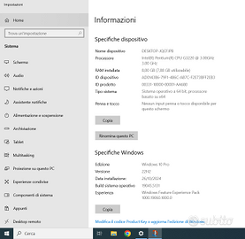 Vendo il seguente PC desktop perfettamente funzionante: CPU: Intel Pentium G3220 3.00 Ghz RAM: 8 GB composti da due moduli Kingston KHX1600C9D3B1 HARD DISK: 500 Gb Seagate 1BD142 Scheda madre: MSI H81M-P33 Lettore CD/DVD Sistema operativo Windows 10