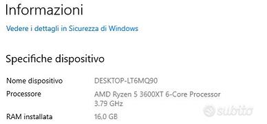 PC Desktop Ryzen 5 3600XT – 16GB RAM – SSD / componenti rivendibili Vendo PC fisso perfettamente funzionante, ideale per: •🧠 uso quotidiano •👨💻 produttività leggera, •🎮 retro gaming, oppure per chi cerca singoli componenti usati da riutilizzare in un’altra build 💪 📋 Specifiche tecniche: •🧠 CPU: AMD Ryzen 5 3600XT (6 core / 12 thread) •🧠 RAM: 16 GB DDR4 3200 MHz •💽 Storage: SSD 500 GB •🖼 Scheda video: NVIDIA GeForce GT 710 (uso base) •🧱 Scheda madre: B550M DS3H •🪟 Windows installato e pronto all’uso 👉 Il PC è reattivo e pronto all’uso, ma volendo potete anche smontarlo facilmente: perfetto per chi vuole CPU, RAM, mobo o SSD a prezzo conveniente. 📍 Consegna a mano su Milano (preferita). 💰 Prezzo: 200 € trattabili.