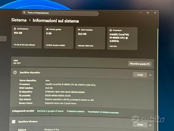 Vendo Pc Desktop workstation/ gaming per inutilizzo. Il pc è in ottimo condizioni e funziona perfettamente Intel core i9-9900k Ram 32gb 3600MHz DDR4 Corsair SSD 1TB nvme M.2 Scheda madre MSI Z390 gaming pro carbon Alimentatore 750w 80plus gold Dissipatore liquido Deepcool castle 240 Case Corsair 4000D airflow Tutte le ventole e le strisce led sono Corsair Scheda grafica Nvidia quadro M4000 8gb Non esistate a contattarmi per altre info Possibilità anche di consegna a mano nella mia zona