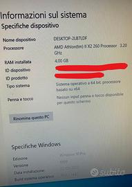 Vendo pc fisso senza monitor tastiera e maus, Internet solo tramite cavo. COMPONENTI PC; SCHEDA MADRE: acer RS880M05A1-1.0-6KSDH SCHEDA VIDEO: msi geforce nvidia GT710 1GB ddr3 RAM: ddr3 2GB ( X2 ) PROCESSORE:AMD ATHLON(TM) II X2 260 3.20ghz HARD-DISK: ssd 240GB PNY CS900 EDIZIONE: windows 10 pro