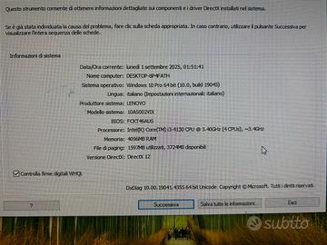 💻 PC fisso completo + monitor + tastiera e mouse – pronto all’uso Vendo PC fisso marca Lenovo completo di monitor, tastiera e mouse, perfettamente funzionante e pronto all’uso. 🔧 Specifiche tecniche: - Processore: Intel Core i3-4130 @ 3.40GHz - RAM: 4 GB - Sistema operativo: Windows 10 Pro 64 bit - DirectX 12 🖥️ Incluso nel prezzo: - Monitor - Tastiera - Mouse - Cavi 📦 Condizioni: - Usato ma funzionante - Nessun problema 💰 Prezzo: 60€ (trattabile) 📍 Consegna a mano in zona oppure spedizione a carico dell’acquirente. Contattami per info o altre foto 👍