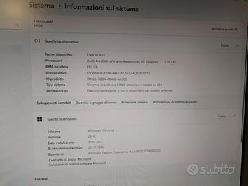 Vendo per inutilizzo PC fisso Desktop Asus M11BB con processore AMD A4-6300 APU with Radeon Graphics e scheda video AMD RADEON HD 7300 series 1GB. Memoria ram composta da 4 listelli per un totale di 11gb aggiornabile. 2 hard disk: 1 SSD da 160gb e un altro Hard Disk da 1TB. Windows 11 già installato e resettato pronto all'uso. Lettore di schede sd, masterizzatore di cd/dvd, 8 porte USB, scheda WiFi a doppio canale: 2,4 e 5 GHz. Pc perfettamente funzionante in ogni sua parte e tenuto sempre con cura. Senza nemmeno un graffio, come nuovo. Disponibile all'installazione di software e/o programmi personalizzati specifici a propria scelta con piccola aggiunta di denaro da concordare. Per qualunque informazione, non esitate a contattarmi. Ritiro disponibile a Cinisello Balsamo